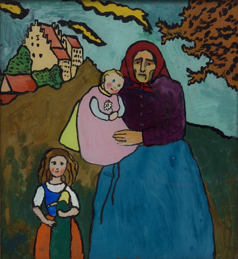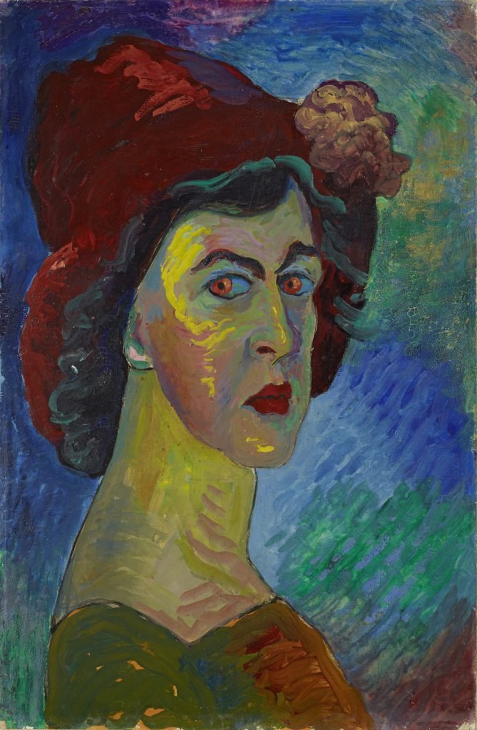 Female Blue Riders had equal billing, and one of the most powerful images is by the Russian Marianne Werefkin – who had a long-term unconventional partnership with another Russian Blue Rider, Alexej Jawlensky. Her 1910 self-portrait, celebrating her 50th birthday, features a bold glare at the viewer through blazing orange eyes beneath a crimson hat, in strikingly bold strokes that smack of masculine assertion rather than feminine grace.