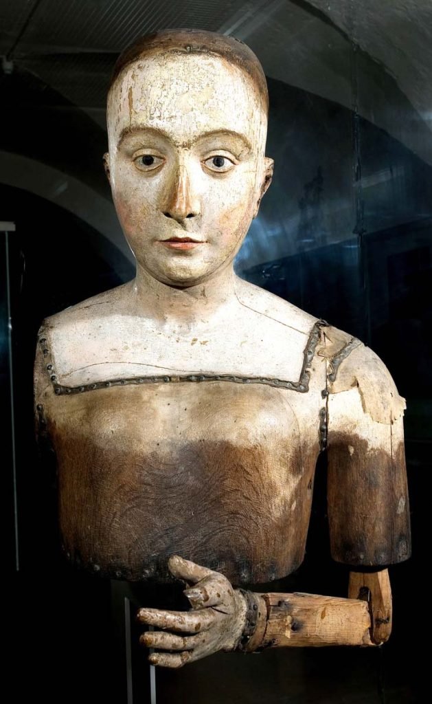 Here too, is Edward III, without the familiar flowing beard and his drooping mouth showing the stroke that killed him in 1377; Richard II’s wife Anne of Bohemia, also made from a death mask; Henry V’s wife Catherine de Valois in a glorious red dress; a plaster Henry VII; his beautiful wife Elizabeth of York; the surprisingly voluptuous body of Mary I. There’s an 18th-century waxwork of Elizabeth I, but also her actual corset, and a strangely weird wax Charles II with too short legs and Svengali fingers that might be reaching out for a plump orange.